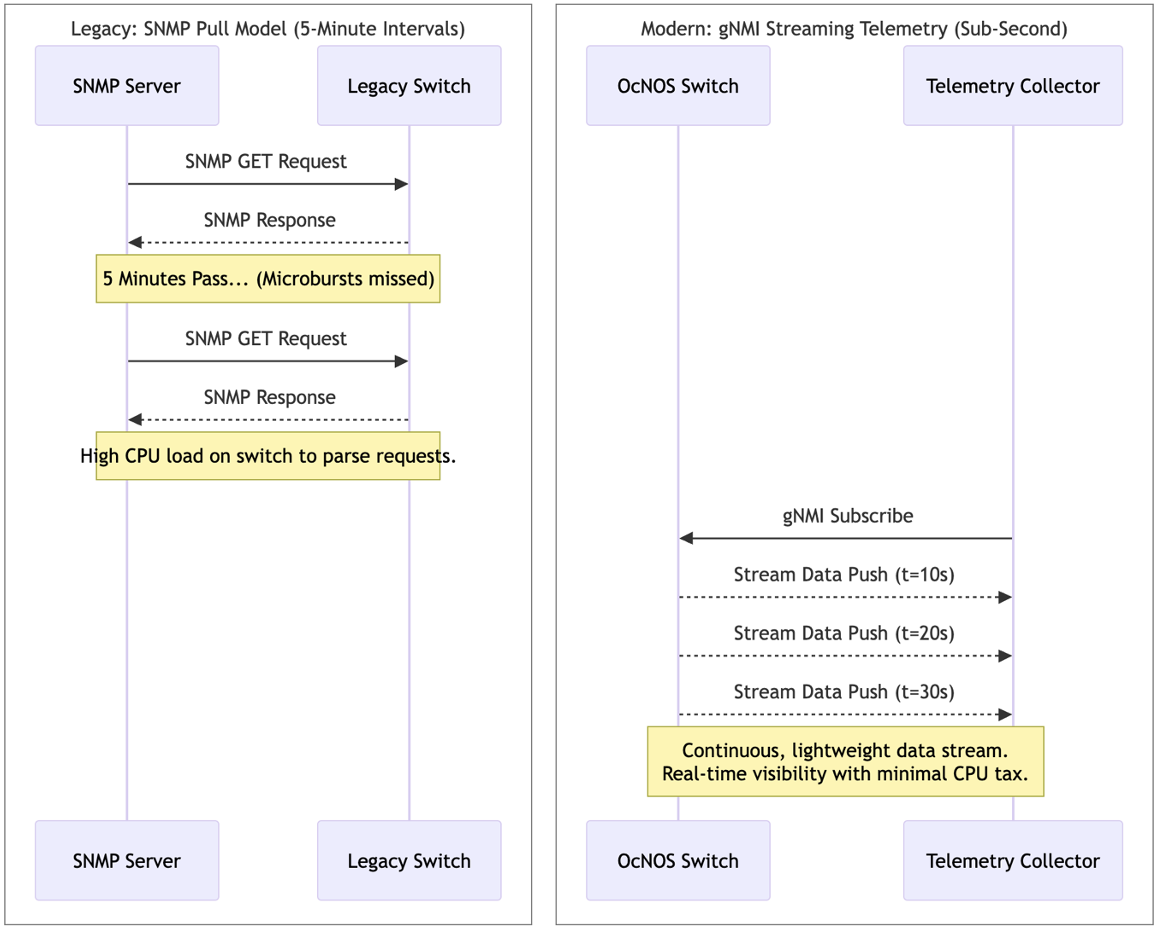 Legacy SNMP wasn’t built for this. Forcing a router to gather and process this massive volume of optical data every 5 minutes overwhelms its CPU. Furthermore, waiting 5 minutes to find out an optical laser is degrading is entirely unacceptable. By the time the SNMP poll alerts the team, customer traffic has already been dropping for minutes.